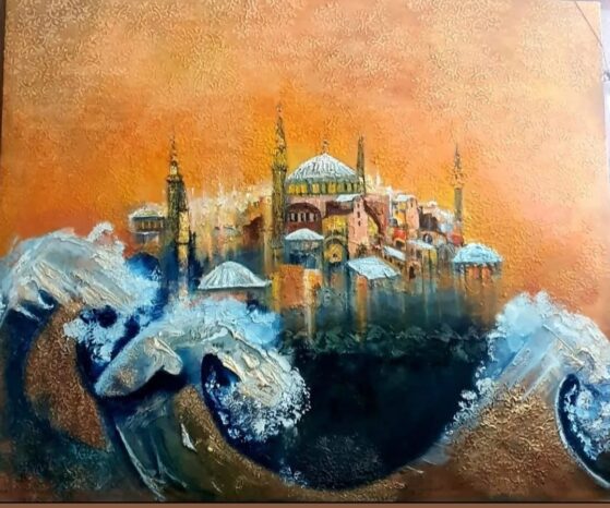 لوحة عن الحضارة اليمنية بأسلوب معاصر.