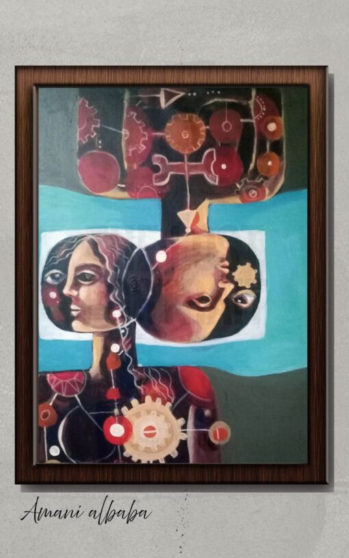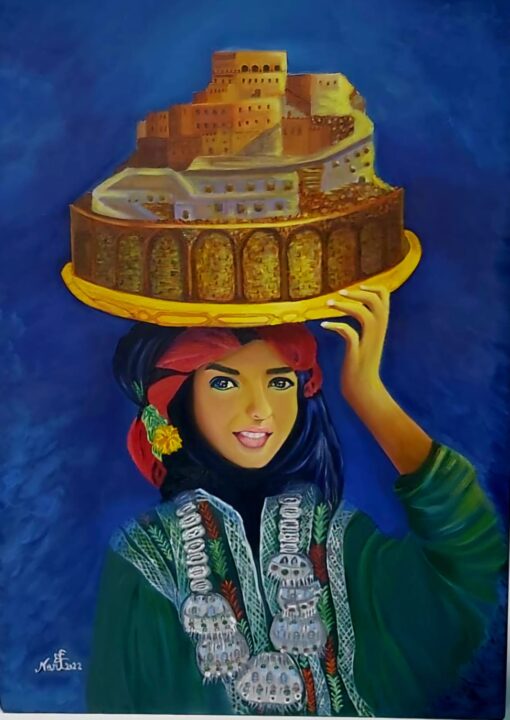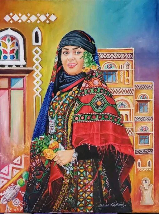ملكة سبأ . زيتي واكريليك على كانفاس .. لوحه تربط علاقة المرأة اليمنيه بالحضارات اليمنيه والطابع المعماري اليمني والتناغم العميق بالزي اليمني القديم للمرأه اليمنيه والطابع المعماري والنقش الحجري الأصيل