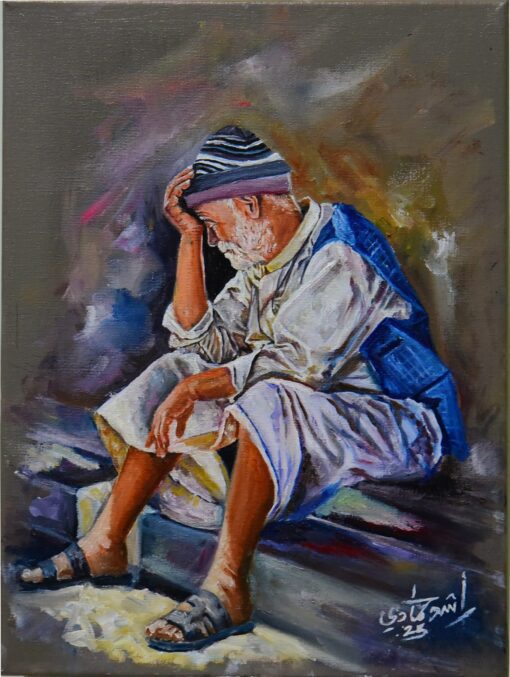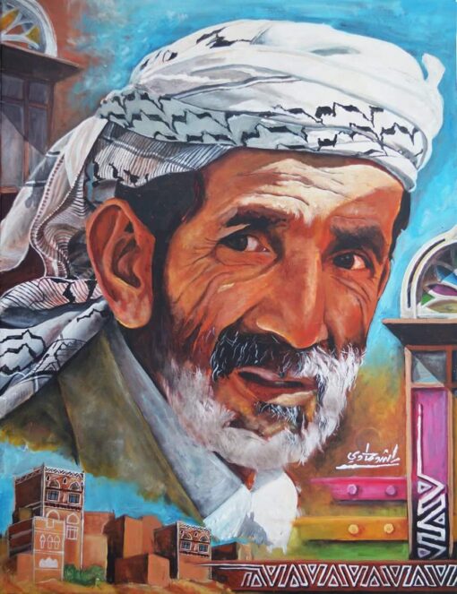 اكريليك على كانفاس اللوحه تجمع بين علاقه الرجل اليمني بالنمط المعماري والشموخ