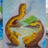 An oil painting, or acrylic, expresses a moment of waiting, heavy and loaded with silence. A man sitting in a rickety chair, his face is disillusioned, his features tired. One hand holds a small red jewelry box as if it holds a dream that never comes with a broken ring inside, and the other hand is dangling a chain with a faded shine. The colors between the cold blue of his jacket, the faint yellow in a blurry background, and the pale green of his pants, each color tells a story of despair and silence. The red rose on the floor and the skeleton of a fish on the empty chair are signs of the end of a story or a dream. A painting that embodies a moment of hopeless waiting.