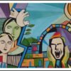 “لوحة تعبيرية سريالية لصف من الشخصيات الذكورية النحيلة ذات البشرة الزرقاء والأرجوانية، تقف على خلفية ليلية من الدوامات اللونية البرتقالية والأرجوانية المستوحاة من فان جوخ. يجمع العمل بين الواقعية المشوهة والتكرار النفسي، مما يخلق سردًا دراميًا حول الرحيل والهوية والفناء في مشاهد ليلية حالمة ومرعبة.”