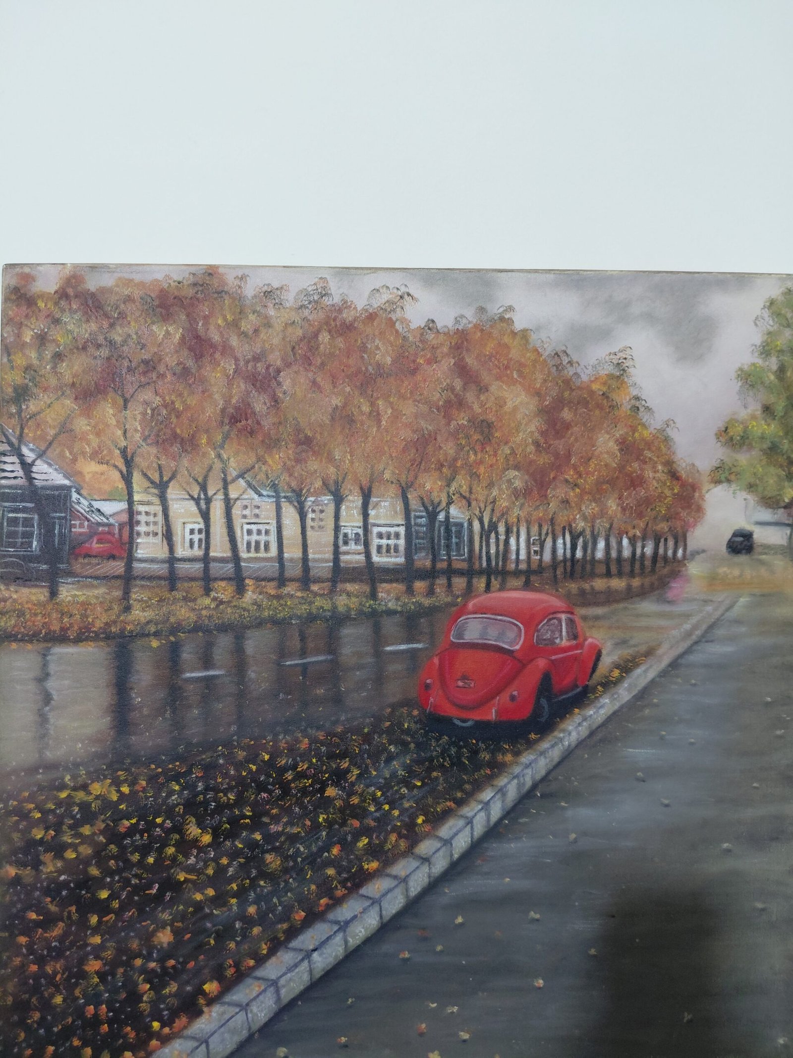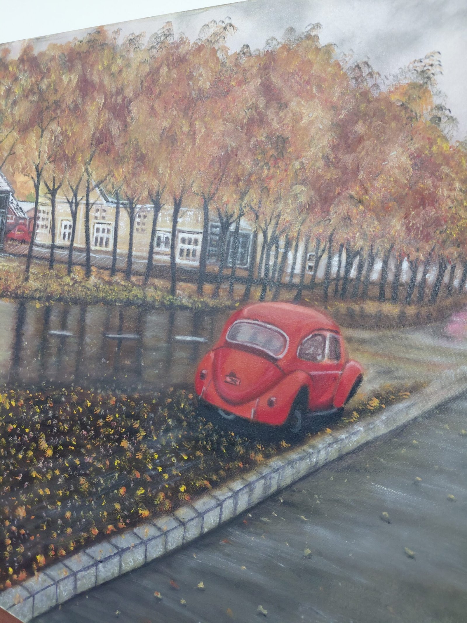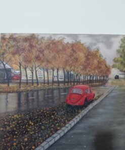 لوحة زيتيّة رسم يدوي تمثل طريقا خريفيا يسوده الصمت والهدوء تلامس الأرواح الهادئة