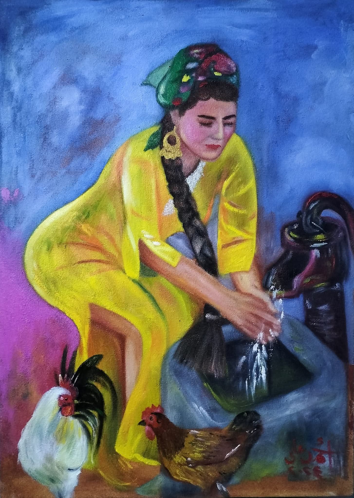 لوحة زيتية أصلية تصور امرأة قروية بزي تقليدي أصفر زاهٍ وهي تغسل يديها عند مضخة مياه قديمة. يحيط بها مشهد ريفي يكتمل بوجود ديك ودجاجة، مما يعكس بساطة وجمال الحياة اليومية في الريف الشرقي بأسلوب فني غني بالألوان المتباينة