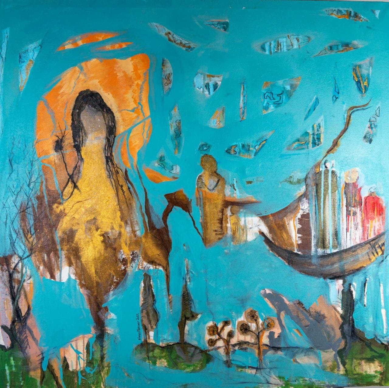 اللوحة هي مزيج من مشاعر لفتاة تائهة داخل أحزانها تبحث عن شعاع ضوء لاستمرار الحياة اللوحة مستخدم بها وسائط متعددة الوان اكريليك ورش ذهبي وقلم فحم واحبار اللوحة نتيجة لتجربة انسانية عميقة ترجمت لعمل فني 8