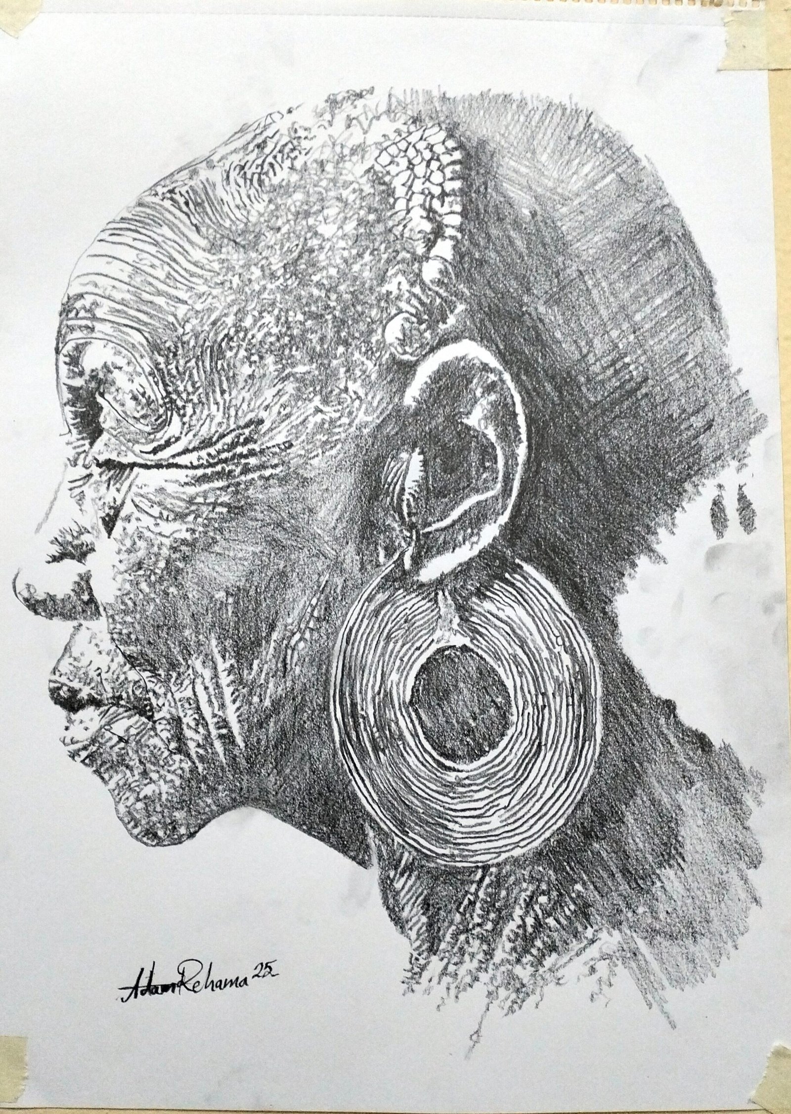 في هذا العمل الذي تم انجازة عبر خامة اقلام الرصاص علي الورق احاول الوصول للتعبير عن وجه امرأة افريقية الملامح كبيرة في السن عبر استخدام التظليل ومعالجة الضوء والتكوين للوصول إلي التعبير والاحساس في وجه الجدة