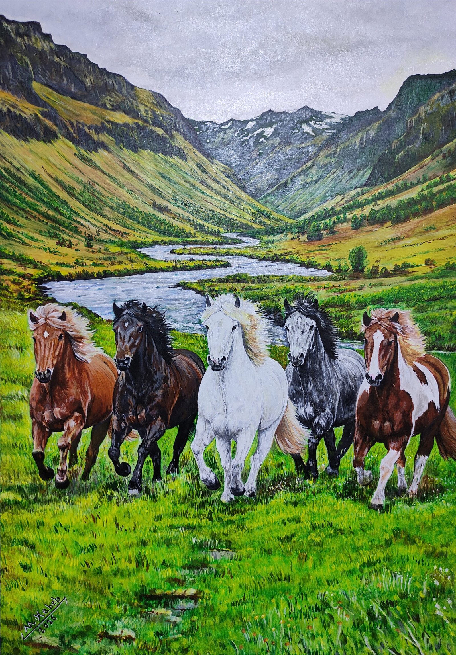 لوحة تنبض بالحياة والحرية؛ خيول تعدو كأنها نبض الطبيعة نفسها، تشقّ الخضرة تحت سماء هادئة. بين الجبال الواثقة والنهر المتلوي، يتجلى مشهد يهمس بالقوة والحرية، حيث كل خطوة تحكي قصة انطلاق بلا حدود.