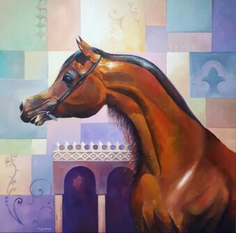 لوحة لخيل عربي أصيل، مع زخارف إسلامية تعكس المجد والتاريخ الإسلامي العريق الذي جاء على ظهور هذه الخيول الجميلة والقوية. مع خلفية لونية متنوعة ومنسجمة، قائمة على دراسة علاقات اللون مع بعضها. إذ تعكس هذه المعالجة للخلفية الجانب المعاصر في الفن، ما يؤدي إلى تصدير مفهوم الأصالة في قالب معاصر يتوافق مع روح العصر وجمالياته.
