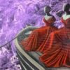 مجموعة من الشخصيات الأنثوية بلا ملامح، ترتدي فساتين بدرجات الأحمر والأصفر، وتجلس في صمت على قارب خشبي يطفو فوق مياه هائجة تتماوج بألوان البنفسج والأبيض، في مشهد سريالي يثير القلق والتأمل في آنٍ واحد.