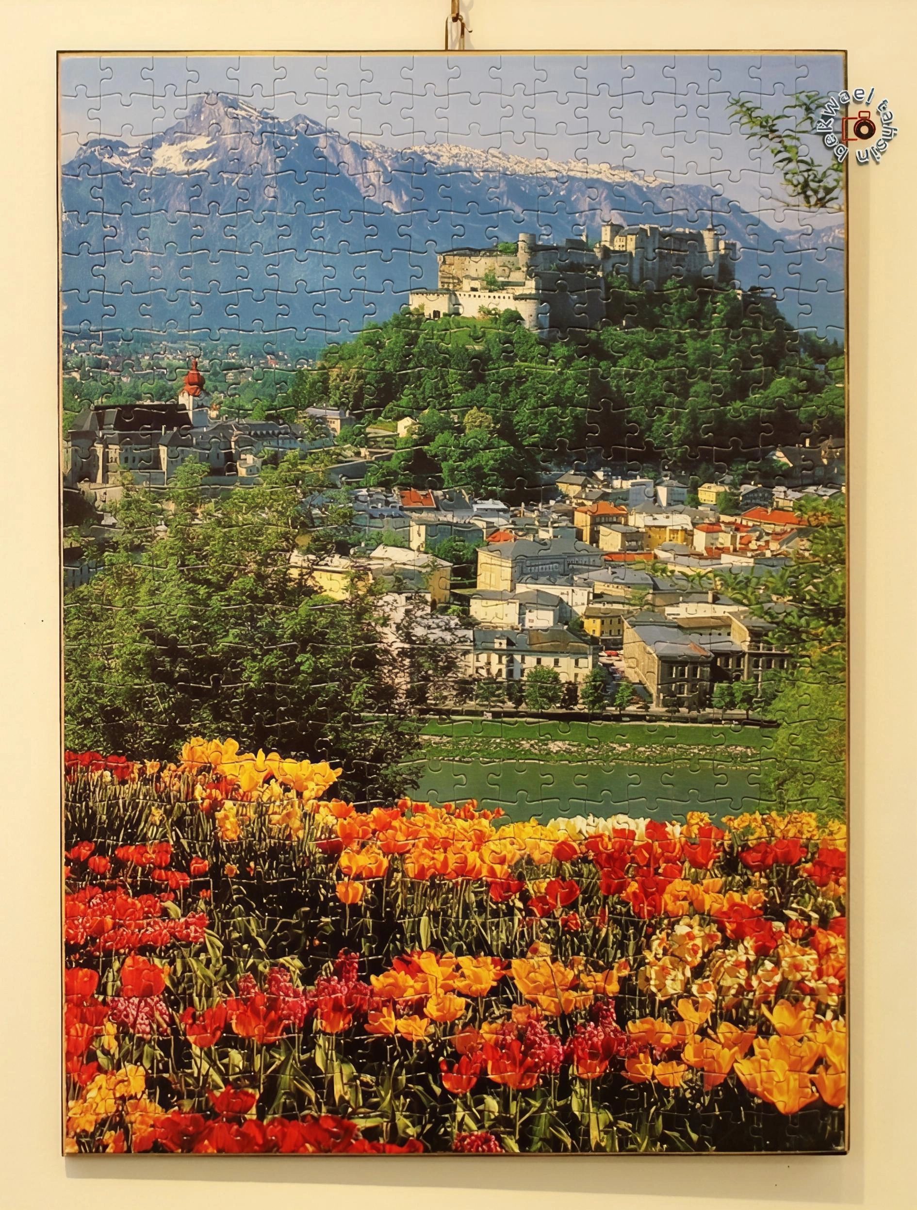 في أعلى التلة، ترتفع القلعة كأنها شاهدٌ قديم على مدينة تنبض بالحياة أسفلها. تتداخل البيوت بألوانها الدافئة مع الخضرة الكثيفة، بينما تحرس الجبال البعيدة المشهد بحضورها الصامت.