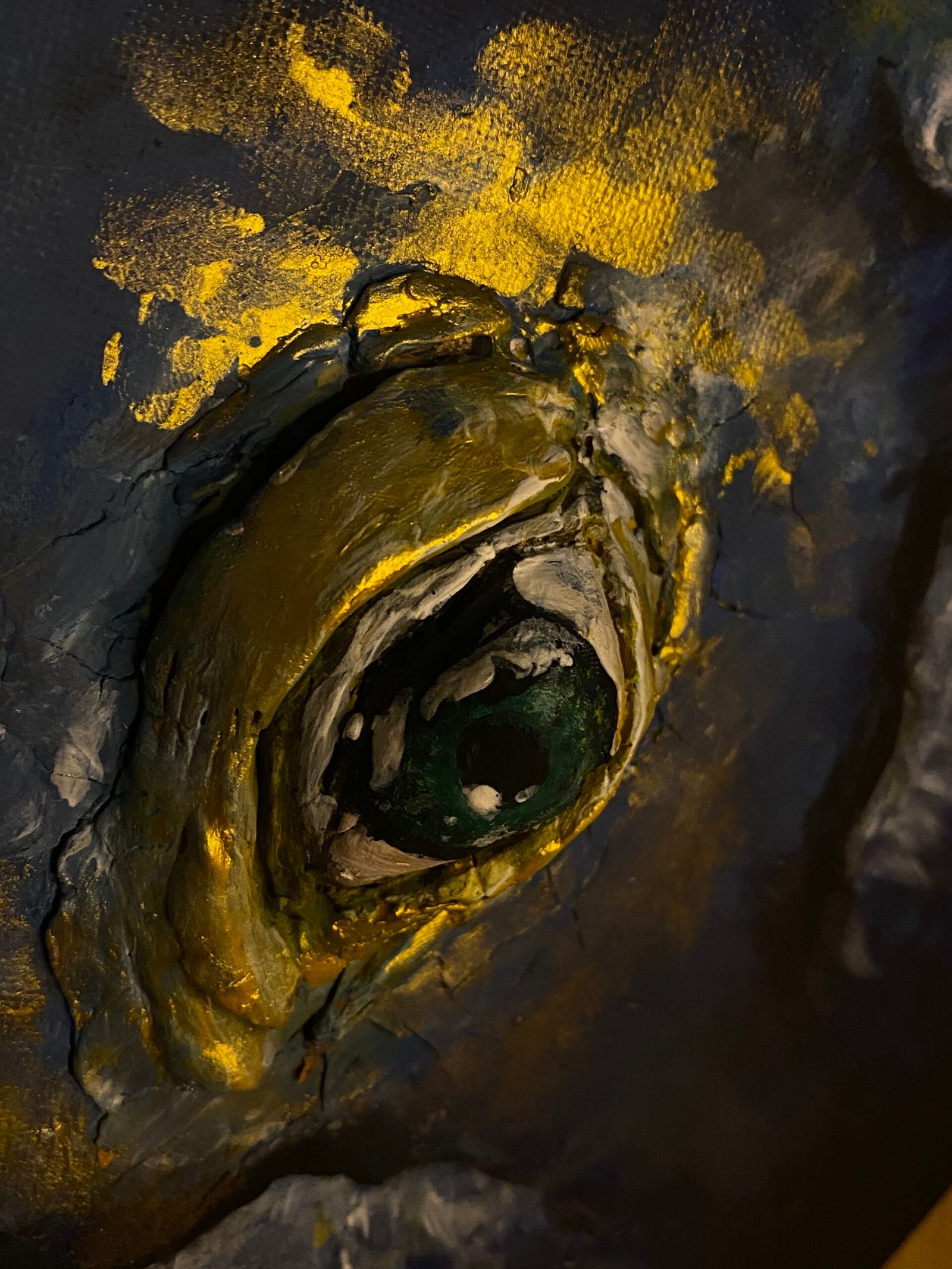اللوحة تعطي طابع بالثقل في المكان المتواجدة فيه بسبب خامة الألوان واللون الذهبي الذي يعطي شيء متكامل للوحة