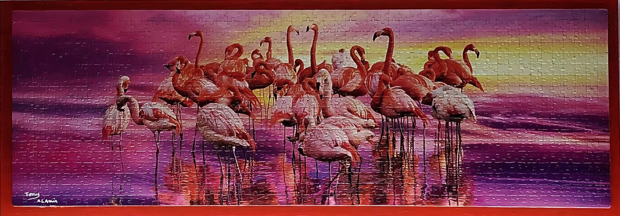 في هذه اللوحة، يصطف الفلامينغو فوق صفحة ماءٍ تتشرب آخر ألوان النهار. تتداخل درجات الوردي، والأرجواني، والذهبي، لترسم لحظة عابرة بين الضوء والظل—لحظة تذكّر بأن الجمال الحقيقي هو ذاك الذي لا يستأذن أحدًا ليولد.