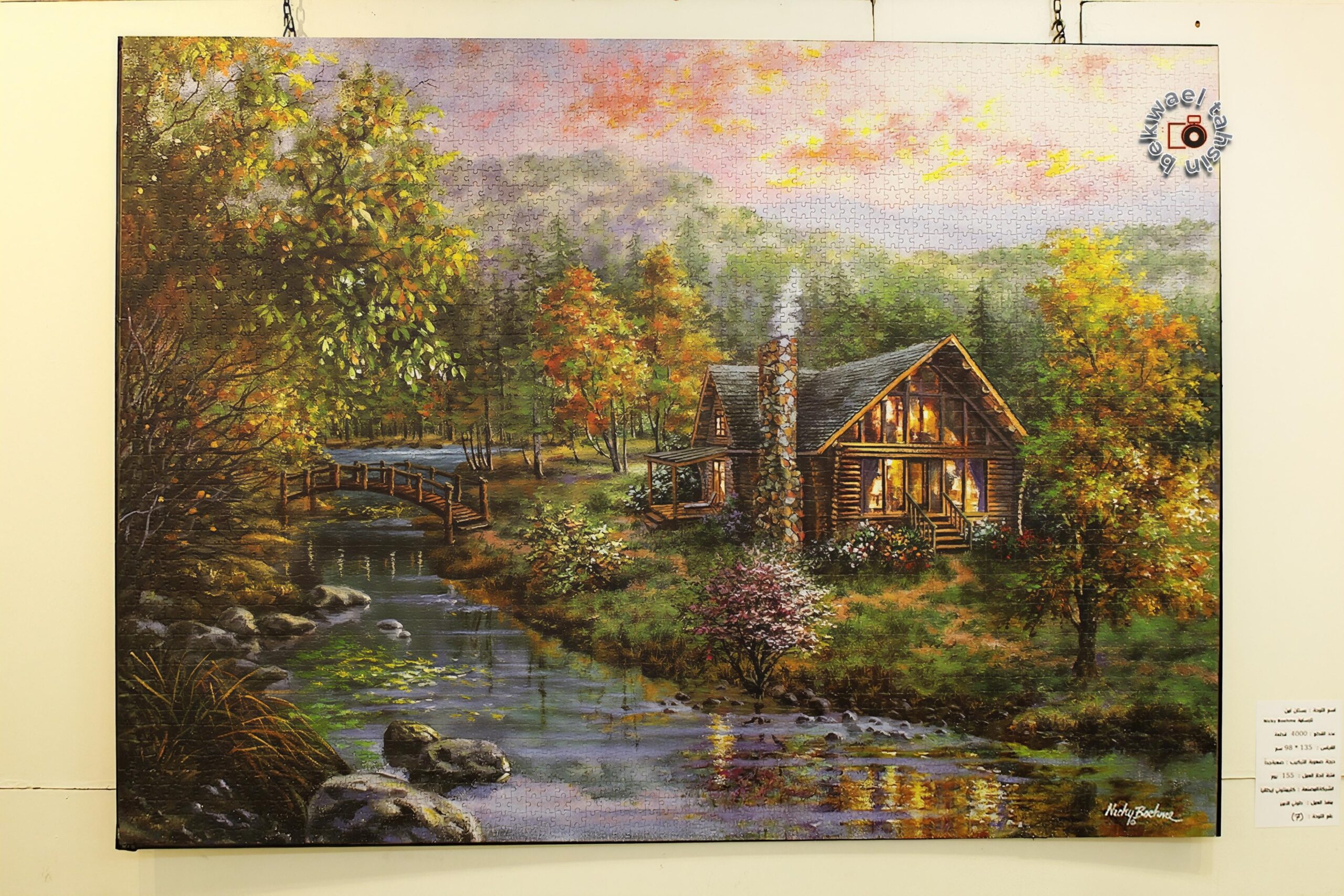 كوخ دافئ يلمع وسط الغابة، بينما ينساب الماء بجانبه كأغنية هادئة لا يريد أحد إيقافها. الألوان الغنية، الغروب البنفسجي، وانعكاسات النهر… كلها تفاصيل مرسومة بروح شاعرية، ثم جُمعت قطعةً بعد قطعة لتولَد من جديد كبازل فنية كاملة.