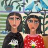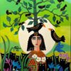 لقاء على ضفاف النيل، من مجموعة "قارب الحياة"، تأمل شعري في الحب والاتحاد الروحي. يجلس عاشقان معًا في قارب مزهر، يتبادلان الأزهار كما لو كانا يتبادلان عهود القلب. ترافقهما القطط والطيور، حارسات الحدس والحرية، بينما يرسخ النهر المتدفق والشجرة المزهرة حميميتهما في إيقاع الطبيعة الأبدي. رُسم العمل بأسلوب فني شعبي، يحمل في طياته البراءة والعمق، حيث تتحول المنظورات المسطحة والألوان النابضة بالحياة إلى رموز للتناغم والإخلاص والتواصل الإلهي. يصبح النيل نفسه أكثر من مجرد خلفية، بل هو شاهد خالد، يمثل تيار الحياة الذي يحمل الأرواح نحو الوحدة والانتماء. من خلال تفاصيل خيالية وألوان متألقة، يتجاوز هذا العمل حدود الرومانسية، ويدعو المشاهد إلى التأمل في الحب كرحلة مقدسة، تباركها الطبيعة ويحتضنها فيض الروح الأبدي.
