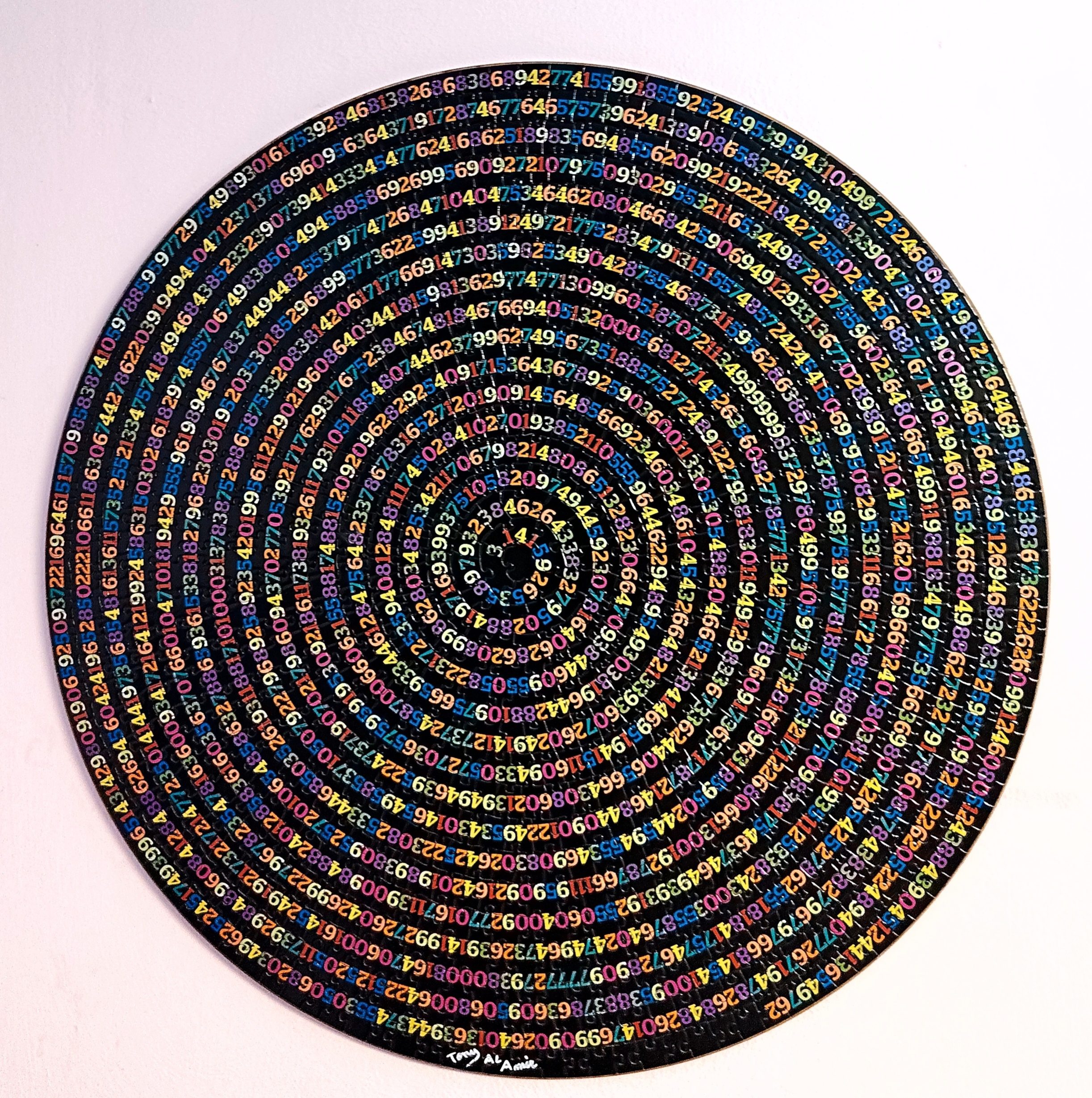 دوائر متتابعة تُحكم قبضتها حول مركز واحد، وكل رقم فيها خطوة صغيرة داخل متاهة لا تكشف سرّها بسهولة. تتكرر الألوان وتتداخل لتخلق إيقاعًا بصريًا يذكّر بحركة الزمن: ثابت في مساره، متغيّر في حضوره.