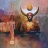 The work references the historical symbolism of the role of Yemeni women in building the Sabaean civilization, showcasing the most prominent sculptural statues of Queen Darin Dhi Sidqan Shams. It also highlights the most important archaeological elements associated with the Sabaean civilization, such as ibex heads, a backrest, and a winged bull statue. Compositionally, the work is built around a main element, the statue of the queen, emphasizing its importance. The color treatment was designed to connect the elements of the work, creating an overall harmony between the form and the background.