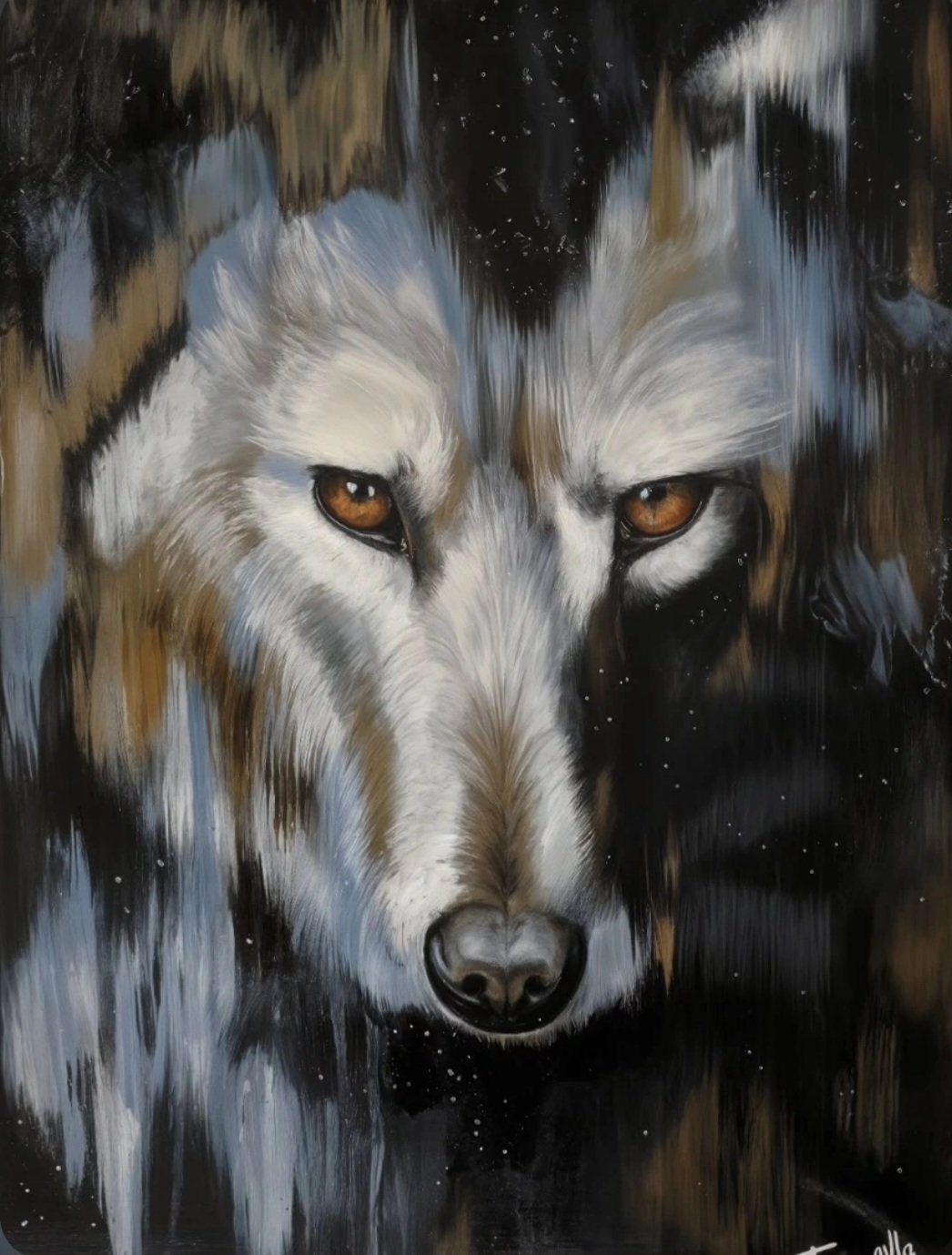 Your attention is drawn to the wolf’s fusion with nature by two amber stones that glimmer in the darkness; and when you focus, you find that they are its eyes staring back at you.