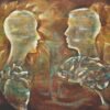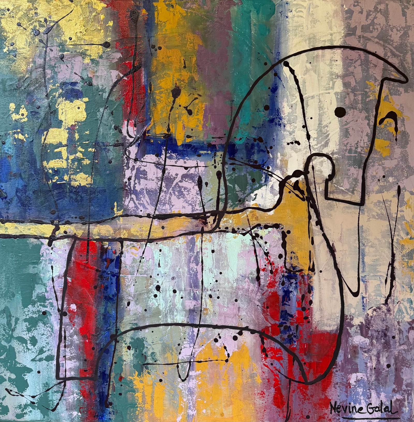 The painting shows a wooden horse, a childhood toy, is drawn with free black lines over a vibrant, richly textured background. The artwork combines a joyful, childlike spirit with modern abstract depth, creating a sense of balance and harmony between simplicity and expressive sophistication.