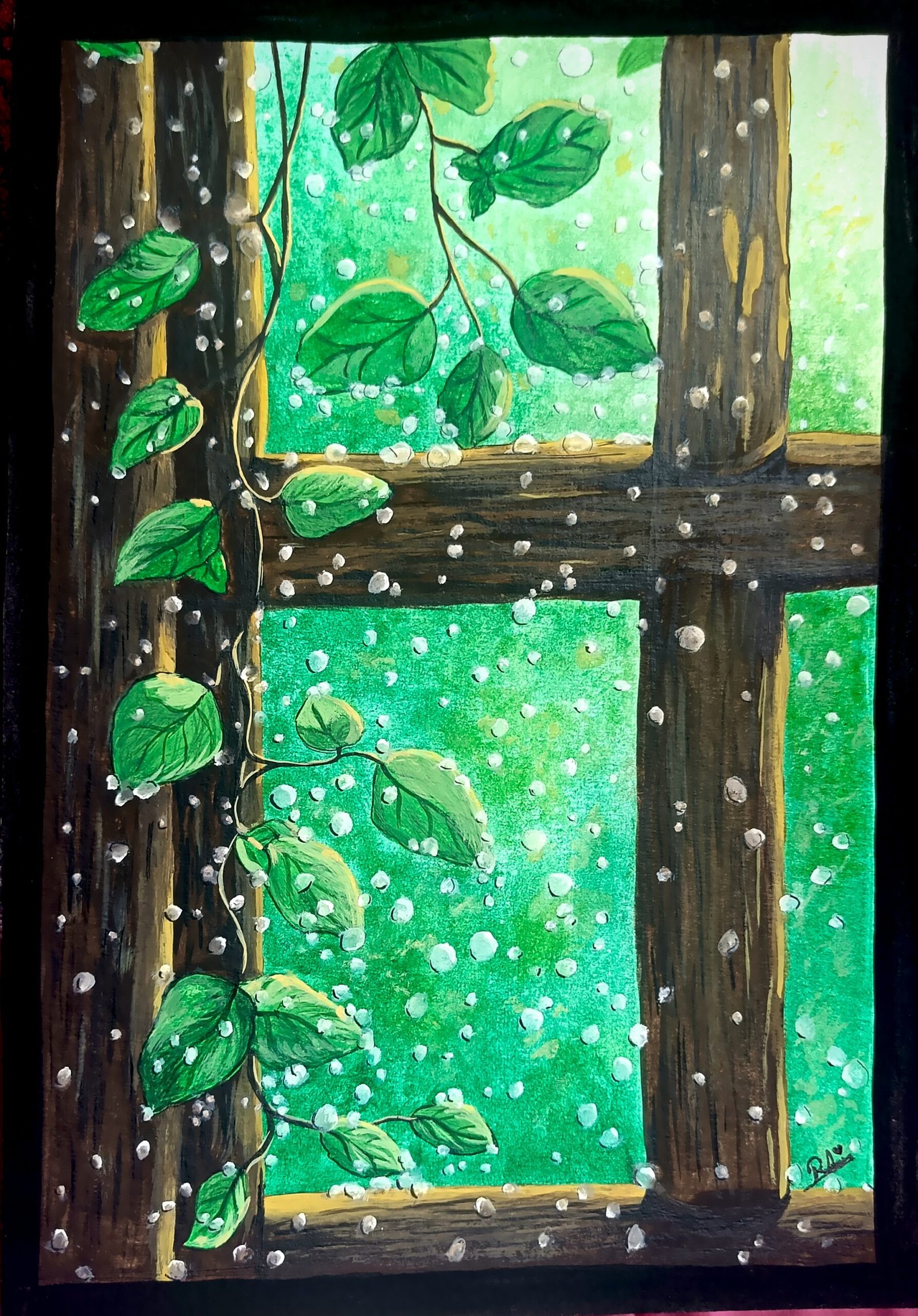 لوحة فنية مميزة تجسد مشهد هادئ من الطبيعة من خلال نافذة خشبية تتسلل منها أوراق النباتات مع قطرات المطر المتناثرة، مما يعطي إحساسًا بالراحة والسكينة.