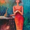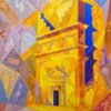 The work addresses camels as a prominent symbol of the Saudi environment, along with the triangle and its formations, which symbolize the art of Sadu. This theme is presented in a contemporary format, intertwined with warm colors, reflecting the nature of the country and its hot climate. It also embodies the strength and greatness of camels in their ability to withstand the heat. The camels’ necks and heads intertwine in the work, suggesting movement and adding a rhythmic and aesthetic character to the painting.