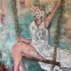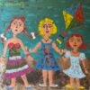 The painting shows three figures standing behind a red bicycle, painted in an abstract style with simple, harmonious colors. The composition takes us back to memories of childhood, where shapes and lines intertwine in an abstract manner, with a rough texture that expresses spontaneity and nostalgia.